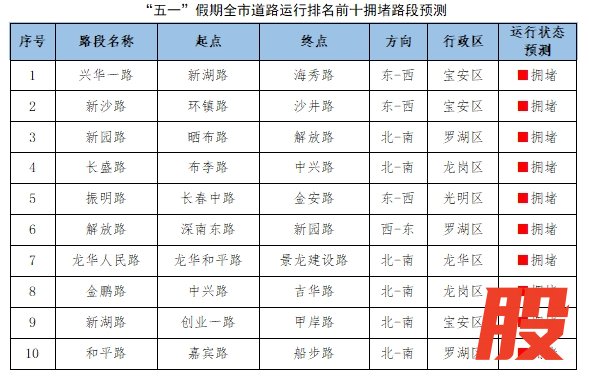 据预测,“五一”假期,全市道路整体交通畅行度为73%,处于基本畅通状态。但也有部分道路通行压力较大。交通部门发布了“五一”假期全市前十拥堵路段,宝安区兴华一路、新沙路、新湖路,罗湖区新园路、解放路、和平路,龙岗区长盛路、金鹏路,光明区振明路,龙华区龙华人民路等路段上榜。