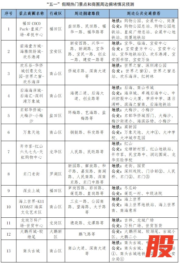 上述景区和商圈周边道路在假日期间面临较大通行压力,建议市民游客出行提前规划行程,关注实时路况信息,尽量错峰出行,避开拥堵时段及路段。深圳部分公园及景区已推出预约停车服务,请市民游客提前预约停车泊位,按照预约的时段前往。由于公园及景区停车位有限,建议尽量选择公共交通,绿色出行。