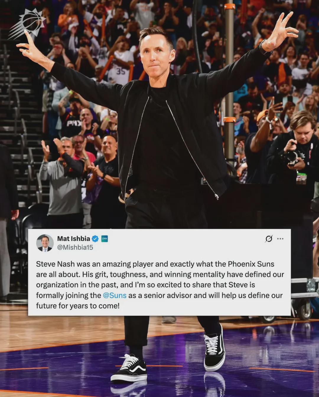退役之后,纳什先是在15年出任勇士球员发展顾问,17年跟队拿到NBA总冠军,20年9月担任篮网主帅22年11月份下课,如今又以太阳高级顾问身份回归了赛场。