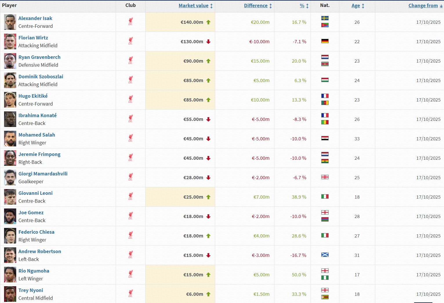 北京时间10月17日融易盈,德转市场更新了最新一期的英超球员身价。利物浦队中伊萨克身价上升2000万欧元,赫拉芬贝赫上升1500万,维尔茨下跌1000万欧元。